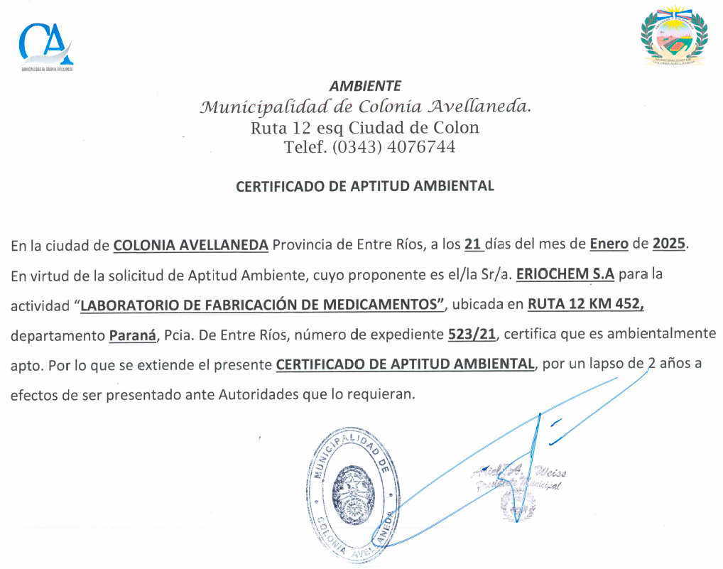 Eriochem S.A. tiene el agrado de informar que la Municipalidad de Colonia Avellaneda le ha otorgado el CERTIFICADO DE APTITUD AMBIENTAL para el desarrollo de sus actividades de fabricación de medicamentos en la planta ubicada en Ruta 12 km 452 de Colonia Avellaneda, provincia de Entre Ríos.